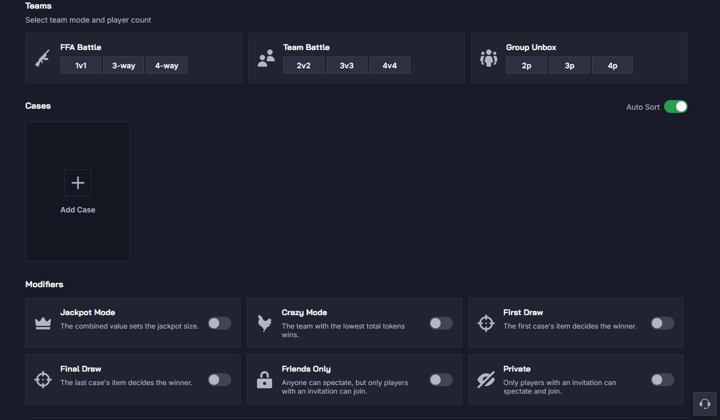 However, there are tons of extra (optional) rules that you can select when playing Case Battles on Chicken.gg. You can, for example, not battle, and just open cases together. The profits of all players then get split equally between every participant. Alternatively, you can spice things up and go for a team battle.