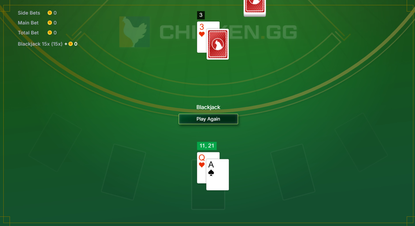When you sit at Chicken.gg’s virtual Blackjack table, you will see several betting circles. There is the main bet, which is where you place the bet you’re wagering on the main Blackjack game. Then, there are also the side bets (Lucky Ladies, 21+3, Blackjack 15x, and Perfect Pairs). These are optional; you don’t ever need to place any chips here if you’re not interested in side bets.