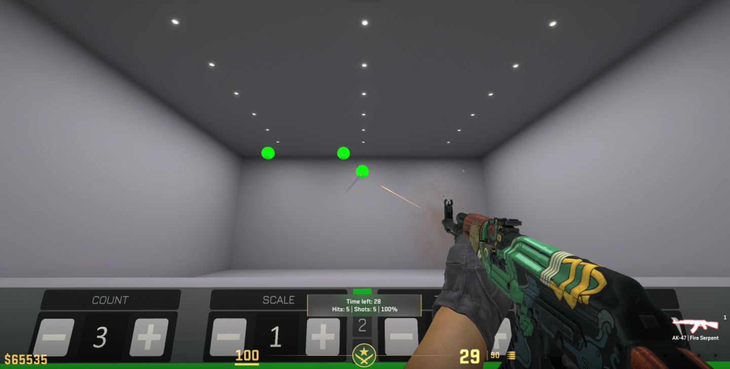 5. Add bot movement and obstacles to the mix, try to kill the bots as efficiently as possible while using a variety of techniques (spraying, one-tapping, bursting, …)
